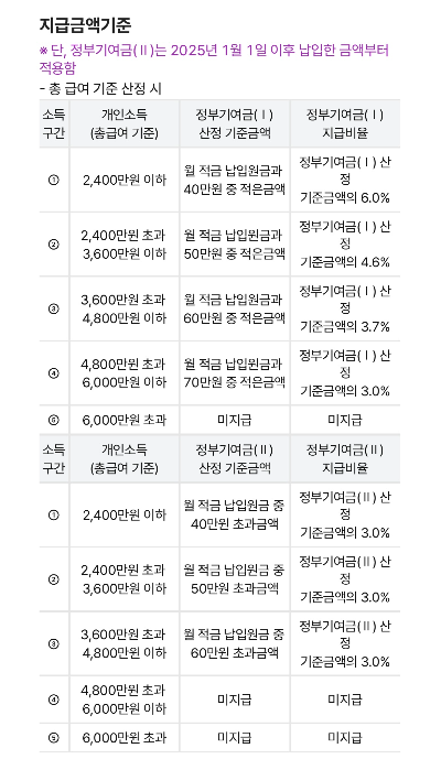 ● 정부 기여금: 소득 구간에 따라 매달 일정 금액이 추가 지원됩니다. 예를 들어, 낮은 소득 구간일수록 더 많은 기여금을 받을 수 있다는 설명이 일반적.